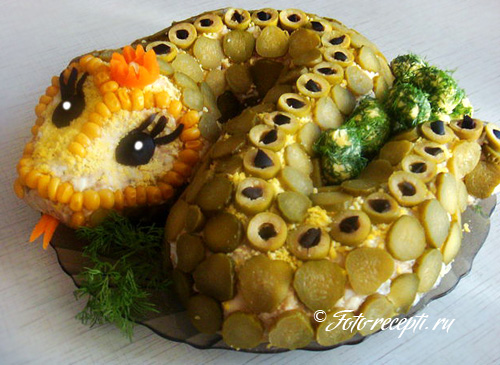 Рецептов салата в виде змеи великое множество - это и вегетарианские варианты, и мясные, и рыбные. Какой приготовить – это дело только личного вкуса и предпочтений гостей праздника. Представляем 10 вариантов салатов на Новый год-2013.