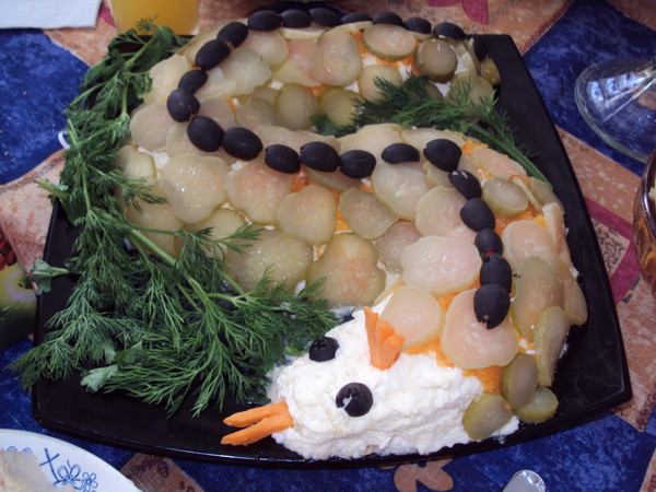 Перечисленные выше ингредиенты перемешиваем. Как всегда, выкладываем новогодний салат 2013 года в виде змеи. Украшаем оливками и маслинами без косточек, нарезанными кружочками, отварной морковью.