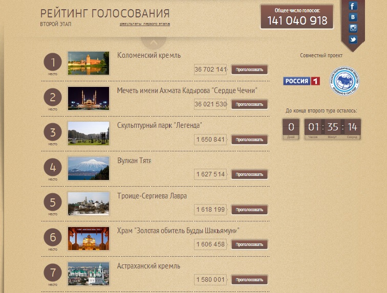 До конца голосования в предпоследнем туре осталось около полутора часов времени. За последний день вперед все-таки вырвался Коломенский кремль, отодвинувший мечеть на второе место. Преимущество составляет около 700 тысяч голосов.