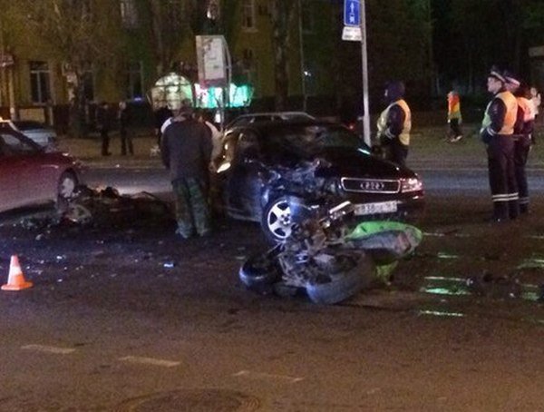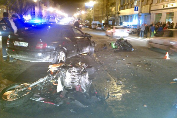 Сегодня на Пушкинской массовое ДТП с двумя мотоциклами устроил водитель-пенсионер за рулем автомобиля «Audi. Авария произошла около 20:00 на пересечении Пушкинской и Ворошиловского.