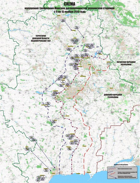 ДНР и ЛНР сегодня 16 ноября 2015 года: ВСУ выдвигают свои подразделения к фронту и занимают демилитаризованную зону. Ополчение продолжает фиксировать факты дерзкой подготовки проходов для возможного наступления силовиков и заброски на территорию Новороссии своих ДРГ. Ярким примером в ситуации является н.п.Широкино, которое в свое время ополченцы добровольно покинули. Теперь, руководство ВСУ, воспользовавшись перемирием в одностороннем порядке ведет активное наращивание сил личного состава и техники вдоль всей линии соприкосновения, проводит дообеспечения вооружением и матсредствами. По данным разведки ВСН киевская армия сосредоточила у линии разграничения сторон 322 единицы военной техники, 173 их которых Минским меморандумом категорически запрещены.
