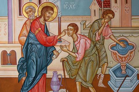 Однажды в субботу Христос шел с учениками и увидел слепого, просящего милостыню. Ученики стали расспрашивать, за свой или родительский грех он рожден незрячим? Иисус сказал, что он слеп не из-за своих или родительских грехов, а для того, что бы на нем явились дела Божии. Христос смешал немного Своей слюны с землей, и этим брением помазал слепому глаза, после чего отправил умыться в купальню Силоам, говорится в 9-ой главе Евангелия от Иоанна.