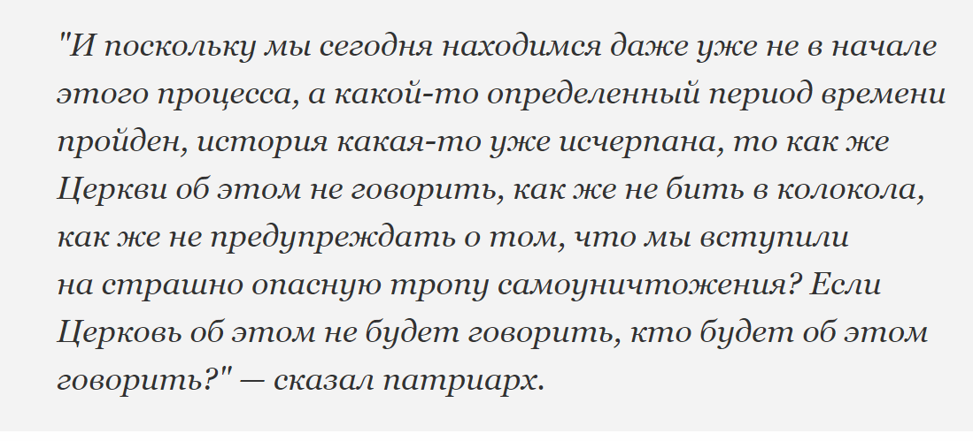 По словам патриарха Кирилла, зло не является жизнеспособным, как и система, в которой оно существует. Но если зло вытеснит из человеческой жизни добро, то придет конец всему.