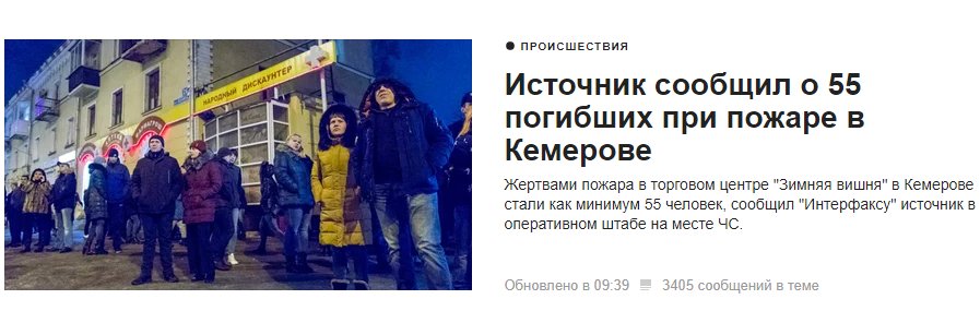 Мы тоже хотим расстроить Марину Королеву. На данный момент в Яндекс-браузере по теме пожара в Кемерово федеральные и региональные СМИ опубликовали более 3400 сообщений. Многие издания ведут онлайн трансляции.