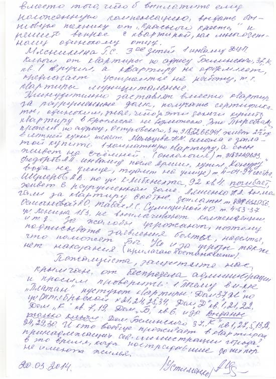У пострадавшего населения возникает вопрос: почему в городе Крымске, микрорайоне «Платан», пустуют квартиры, принадлежащие городу, в то время как многие из них до сих пор не получили компенсаций и квартир? В некоторых квартирах живут люди, приближенные к главе района, а остальные для чего-то придерживаются. Хотя, по слухам, квартиры в домах по Октябрьской должны были предоставить пострадавшим. Видимо, «братва из Славянска-на-Кубани» плотно окучила крымскую поляну, и только прямая президентская комиссия сможет навести порядок.