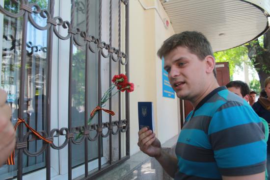 — Я пришел сюда выразить свое отношение к выборам и испортить бюллетень, — заявил один из избирателей, Геннадий, уроженец донецкой Горловки. К консульству он пришел с гвоздиками и георгиевскими ленточками, которые оставил за решеткой окна. — С фашистами о чем говорить можно? Кандидаты кто? Ярош, Ляшко… Вот им, пусть смотрят и вспоминают Одессу, — добавил он, помещая под решетку с гвоздикам фотографии жертв пожара в Доме Профсоюзов.