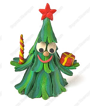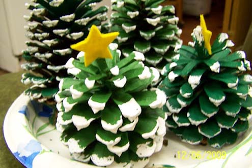 На шишки наносится зеленая краска. После высыхания кончики «веточек» покрываются белой краской. Звездочки и игрушки можно выполнить из пластилина.