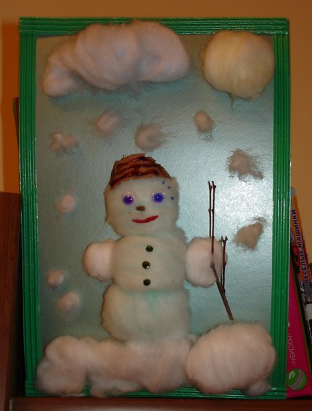 Снеговик выполнен из воздушных шариков и яичной скорлупы. Шарики и скорлупа намазываются клеем и обматываются нитками.