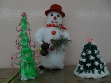 Елочки выполнены из макарон и пластиковой бутылки, каркас снеговика – конус из картона, сверху наклеена вата.