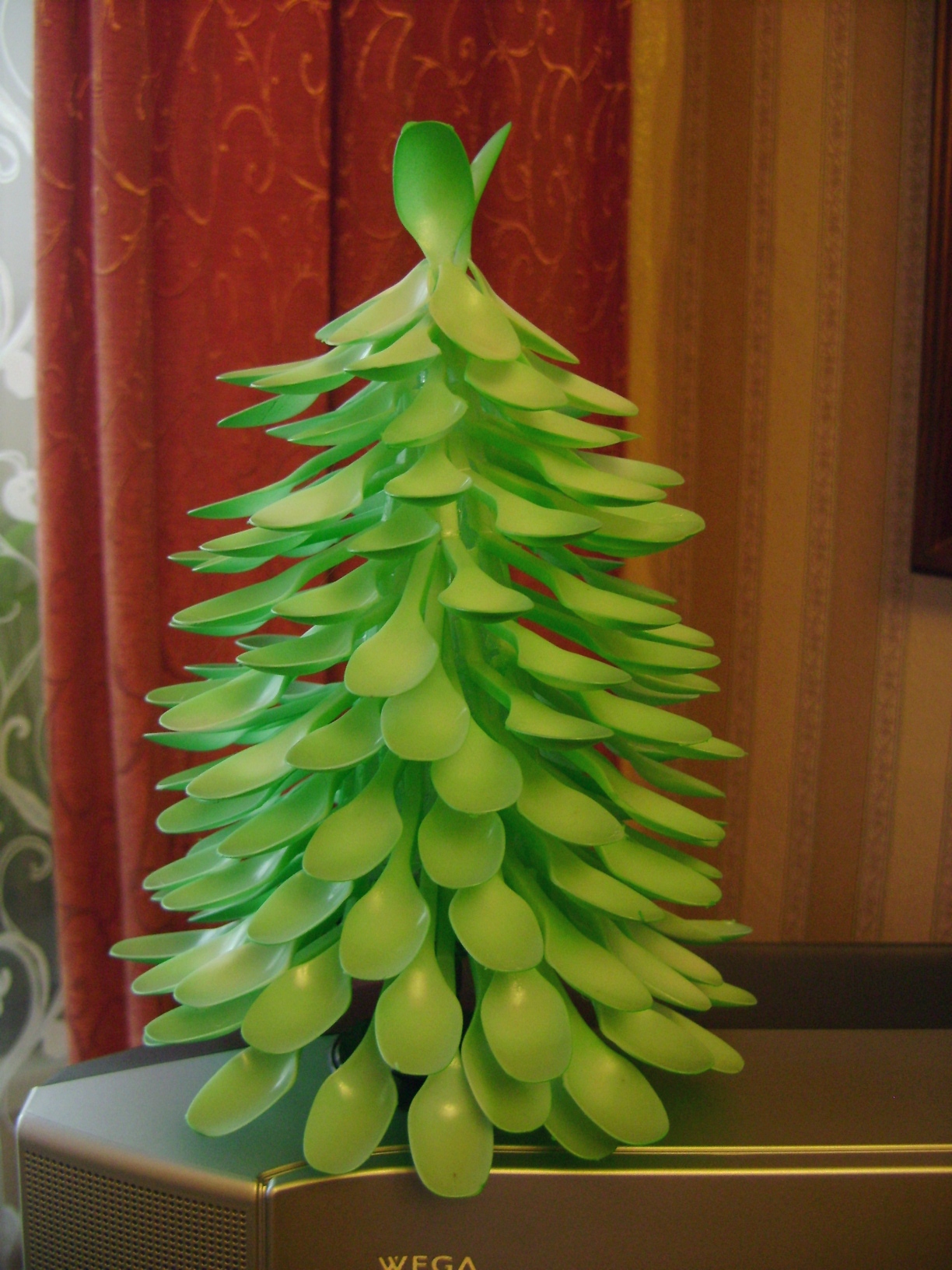 Для изготовления елки были использованы пластиковые ложки, покрытые зеленой краской.