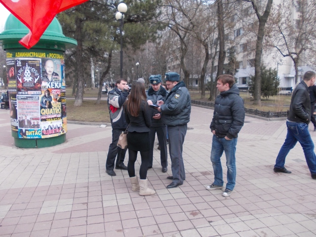 Количество сотрудников правоохранительных органов колебалось от пяти до одиннадцати. Сперва было пять человек, потом - у здания Донской публички - появился "бобик" и еще шесть человек. Впрочем, со временем часть полицейских ушли. Одни - сели в машину ДПС, другие - вообще ушли в неизвестном направлении. К концу мероприятия остались всего трое...