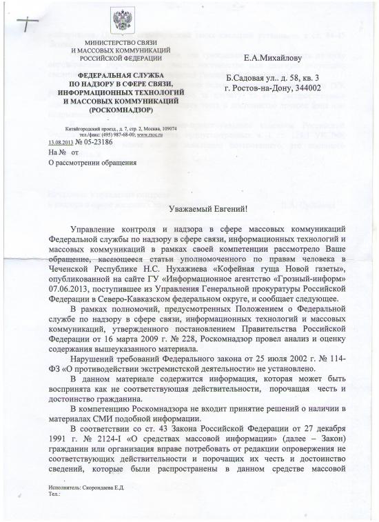 Роскомнадзор Министерства связи и массовой коммуникации РФ ответил на письменный запрос журналиста и лидера общественной организации "За Честь и Достоинство" Евгения Михайлова по поводу публикации на сайте агентства "Грозный-информ" статьи "Кофейная гуща Новой газеты".