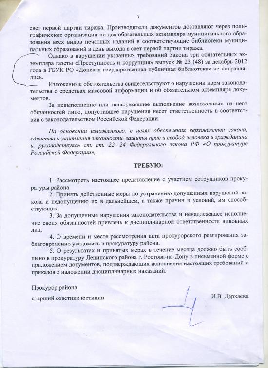 Цитата: «... в нарушение требований закона три обязательных экземпляра газеты «ПиК» выпуск № 23 (48) за декабрь 2012 года в ГБУК РО «Донская государственная публичная библиотека» не направлялись...». А дальше, конечно же, в лучших прокурорских традициях - «Требования». И рассмотреть, и меры действенные принять, и к ответственности виновных привлечь. И обо всем этом в письменном виде прокурору доложить. А еще приложить документы, подтверждающие исполнение. В том числе копию приказа о наказании виновных. Под этим грозным документом стоит подпись: прокурор района, старший советник юстиции И.В. Дархаева.