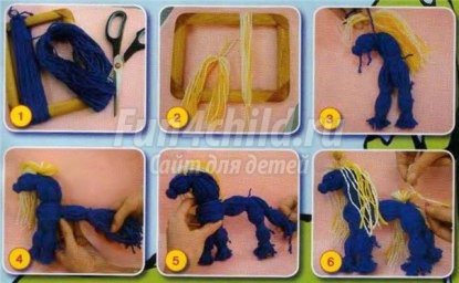 Синие нитки разделите на два пучка. Из первого необходимо соорудить голову, шею и передние ноги, а из второго – туловище и задние ноги. Самой сложной работой в данной процедуре - это правильно перевязать нити.