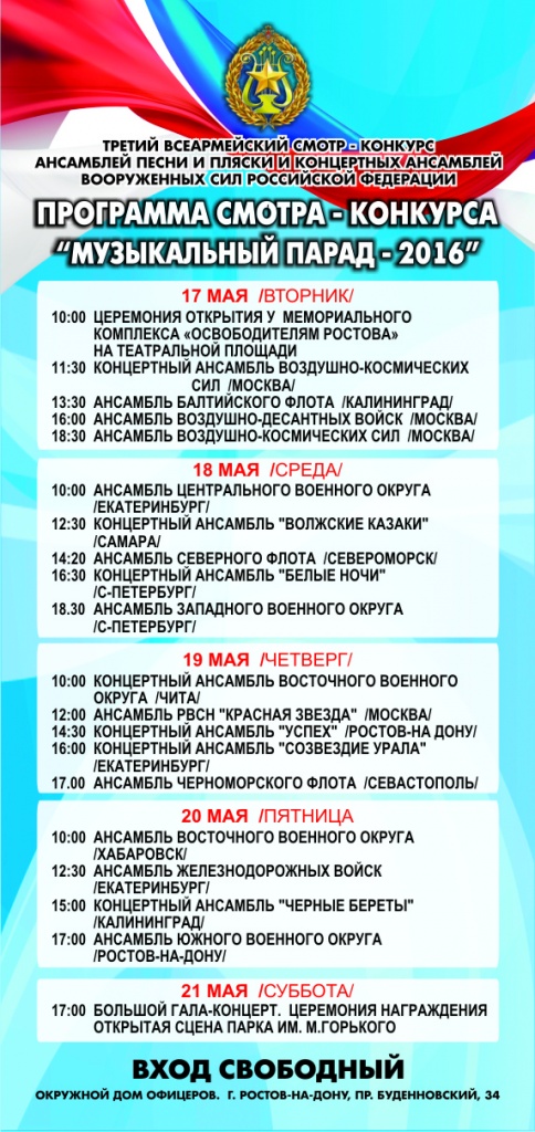 «Музыкальный парад-2016» продлится 5 дней, с 17 по 21 мая, коллективы будут соревноваться в профессионализме и артистизме в Доме офицеров ЮВО. Оценивать данные вокально-инструментальных коллективов будет высокое жюри.