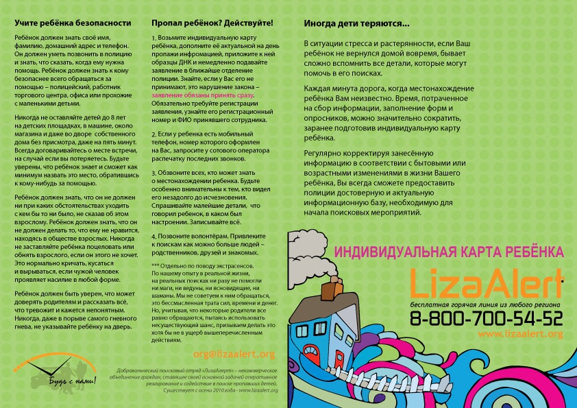 Такая памятка должна быть в каждом доме, где есть ребенок, считают организаторы проекта. Дети пропадают каждый день, и, к сожалению, ни одна семья не застрахована от подобных случаев.