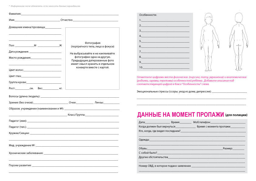 Каждая анкета будет содержать как можно более подробные данные о ребенке, на случай если вдруг он пустился в бега или пропал. Фотография, общие сведения, приметы, привычки, особые приметы, данные для полиции, а также оперативная информация на момент исчезновения.