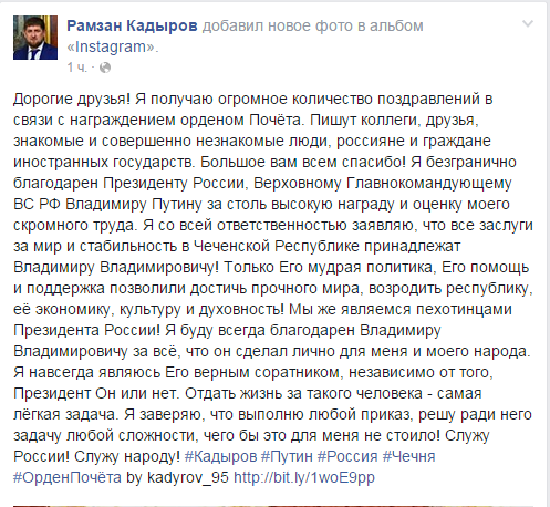 «Я навсегда являюсь Его верным соратником, независимо от того, Президент Он или нет. Отдать жизнь за такого человека - самая лёгкая задача. Я заверяю, что выполню любой приказ, решу ради него задачу любой сложности, чего бы это для меня не стоило!», - написал Рамзан Кадыров.