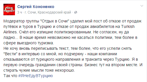 "В связи с открытой поддержкой Турецкой Республики террористической организации ИГИЛ и гибелью наших военных от действий турецкой армии, туристические компании "Юг Курорт МедСервис", "Курорт МедСервис" и "Центр Курорт" объявляют о полном прекращении продаж путевок и туров в любые города и курорты Турции, а также прекращении продаж авиабилетов на самолеты авиакомпании Turkish Airlines", - написал он в группе "Отдых в Сочи" и попросил поддержать движение, поскольку "честь дороже денег". Однако модератор удалил пост. "Счёл его излишне политизированным. Не согласен, ну да ладно...", - отмечает на своей стене Сергей. Свое сообщение он пометил хэштегом #ЯНеЕдуВТурцию.