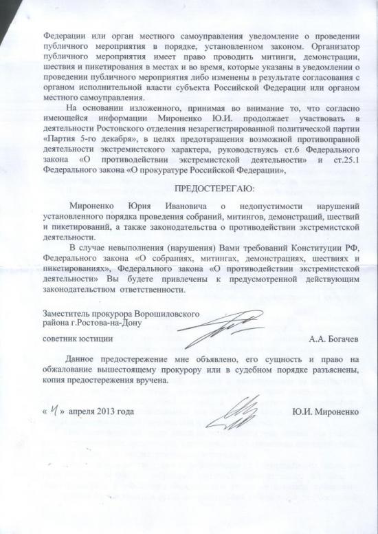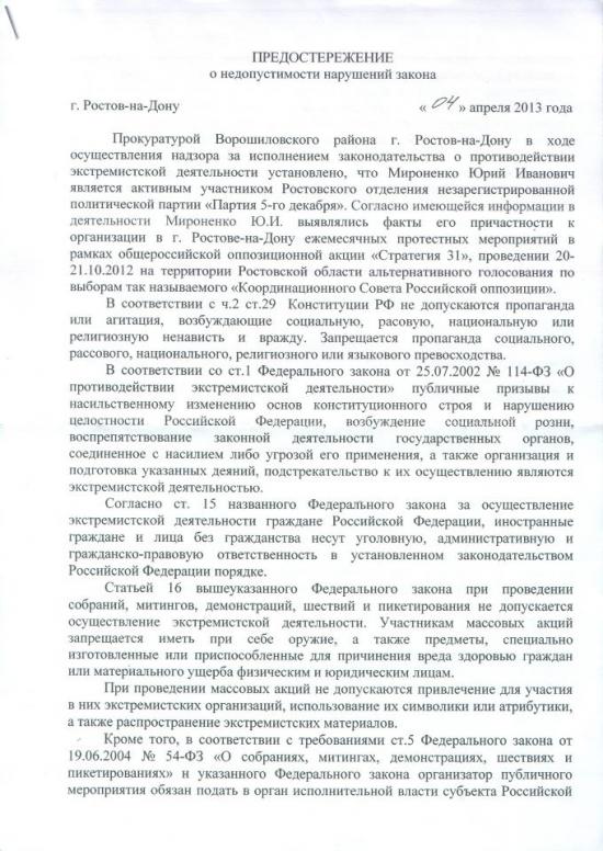 После этого Полунина вручила мне предупреждение о недопустимости нарушения закона. При этом она сказала, что вручает его потому, что я ошибаюсь, дескать, насчёт необходимости санкционирования митингов.