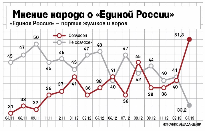 1 мая опрос Левада-центра показал, что 51% россиян уверены, что "Единая Россия" - "партия жуликов и воров".