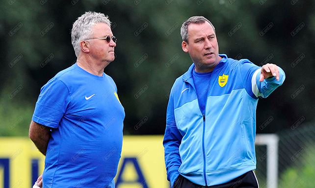 На фото: бывший тренер команды Гус Хиддинк со своим преемником Рене Мелестеном