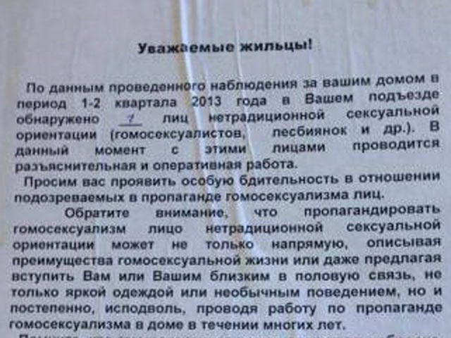На ростовских улицах и домах появились интересные стикеры, в которых содержится призыв проявить бдительность к соседям, похожими на геев и лесбиянок. Также в сообщении подробно расписано, по каким признакам можно сделать такой вывод, а еще отмечено, сколько таковых выявлено в данном районе или подъезде.
