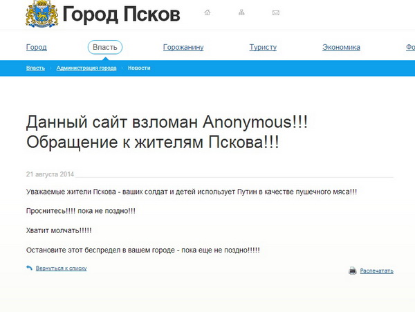 Украинские хакеры на сайте администрации Пскова призывают жителей к мятежу