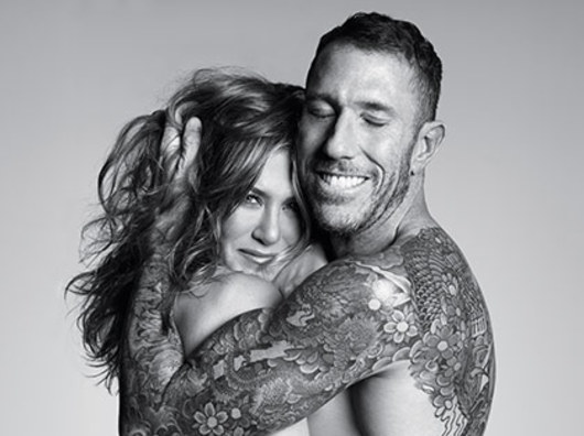 Известная актриса Дженифер Энистон снялась для можного журнала в весьма пикантном виде – топлесс, прижавшись к своему приятелю и личному стилисту Крису Макмиллану.