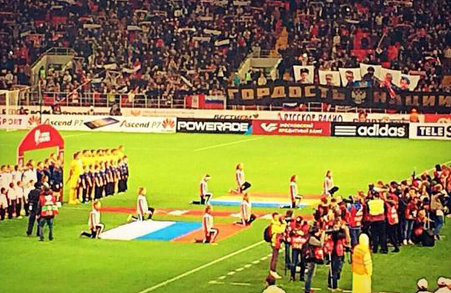 Футбольные фанаты перед отборочным матчем на Евро-2016 Молдова – Россия в первых рядах выставили баннеры с изображением героев Новороссии. Представлены семь портретов: Стрелков, Безлер (Бес), Валерий Болотов и другие. Под портретами внизу лентой: «Гордость нации!».