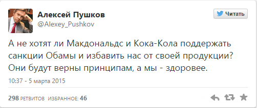 Алексей Пушков призвал американские компании «Кока-Кола» и «Макдоналдс» поддержать своего президента, Барака Обаму, и присоединиться к экономическим санкциям в отношении Российской Федерации. Соответствующее сообщение Пушков оставил в своем микроблоге в Твиттере.