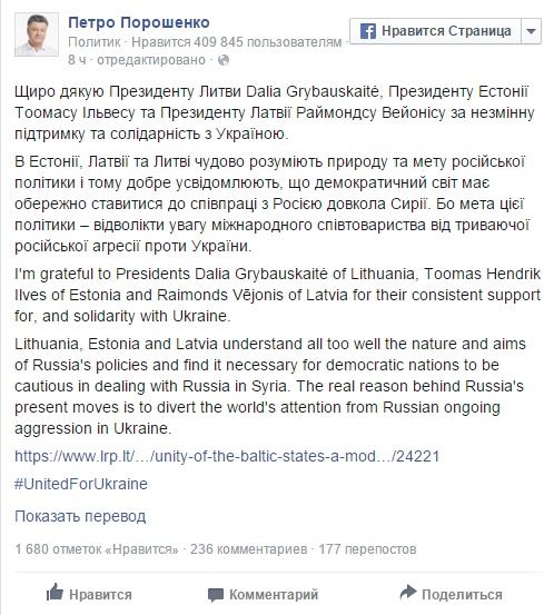 Украинский президент дал оценку действиям РФ в Сирии попутно поблагодарив президентов стран Прибалтики в отказе участвовать в одной коалиции с Россией против группировок ИГИЛ (организация, запрещенная в России).