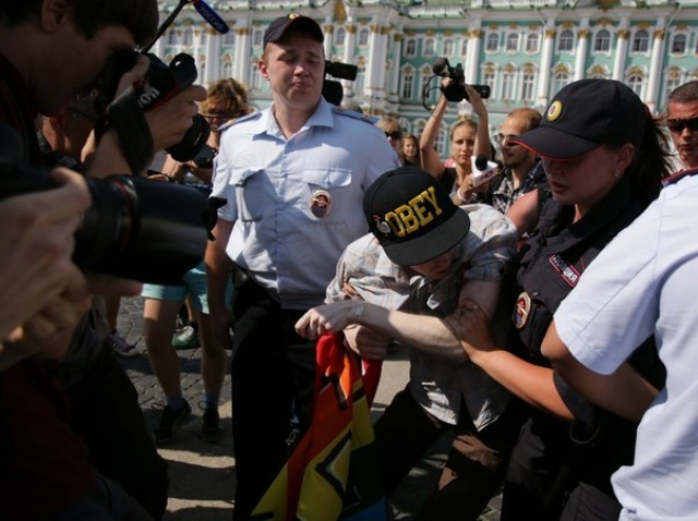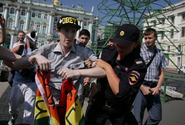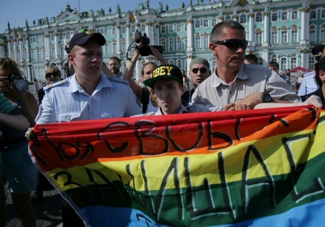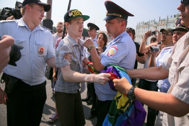В Санкт-Петербурге в день празднования Дня ВДВ на Дворцовой площади был задержан активист, пикетирующий против гомофобии.