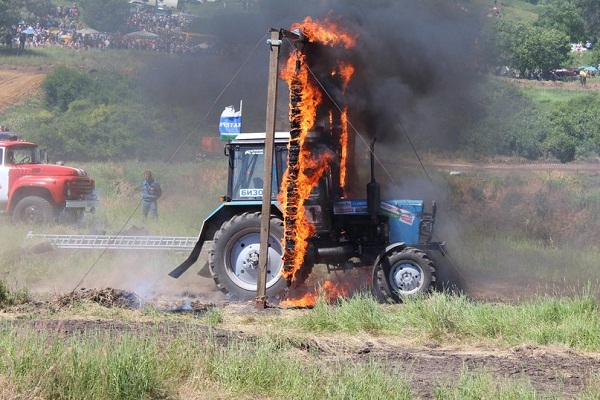 В воскресенье, 7 июня, во время традиционных гонок, которые проходили на трассе «Бизон-трек-шоу» под Ростовом (вблизи 4-го километра дороги Ростов-Таганрог), участник № 13 (Сергей Сапрыкин из Миллеровского района), проезжая на тракторе мимо горящих ворот, случайно протаранил их, в результате чего транспорт загорелся.
