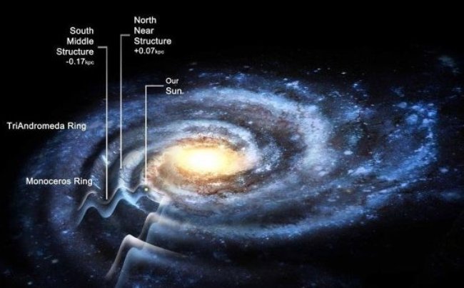 При более подробном изучении выяснилось, что подобные структуры не случайно разбросаны по диску Млечного Пути. Эти регионы, а также разделяющие их зоны относительной пустоты длиной в 13 тыс. световых лет, похожи были на своеобразные складки ткани. Вершины их совпадали с положением спиралей-рукавов Галактики, и это ученым подсказало, что они имеют дело не с регионами с необычайно большой плотностью звездного населения в плоском «блине» Галактики, а с очень неровным диском, так сказать смятым в своеобразную гармошку.