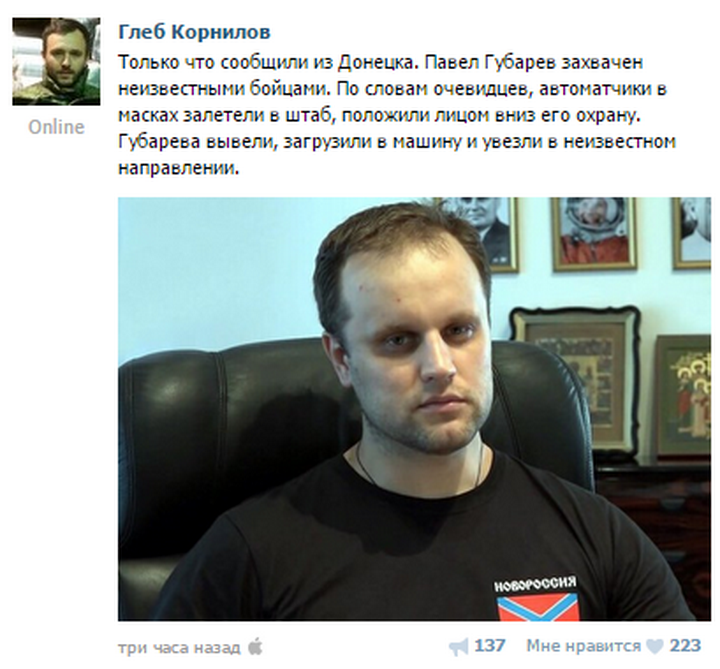 [[Захарченко уверен, что правоохранители Украины его не найдут|Последние новости Новороссии сегодня]]: из Донецка сообщают о похищении лидера движения «Новороссия» Павла Губарева. Об этом сообщил Глеб Корнилов, руководитель местного фонда помощи. По его словам, в штаб залетели автоматчики в масках, которые положили лицом вниз охрану Губарева, после чего его вывели из здания и отвезли в неизвестном направлении.