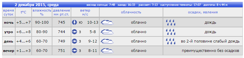 Погода в Ростове 2 декабря: температура утром +6-8°, дождь и облачно, днём температура начнет снижаться +4-6°, так же облачно и небольшой дождь. К вечеру обещают прекращение дождя, облачность и понижение температуры до +1-3°.