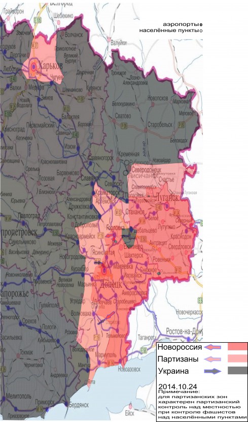 Карта Новороссии с обозначение зон партизанской активности на вечер 24 октября.