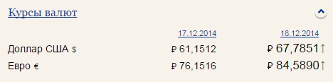 Курс доллара на 18 12 2014 (Центробанк) – 67,78 – подняв его с 61,15