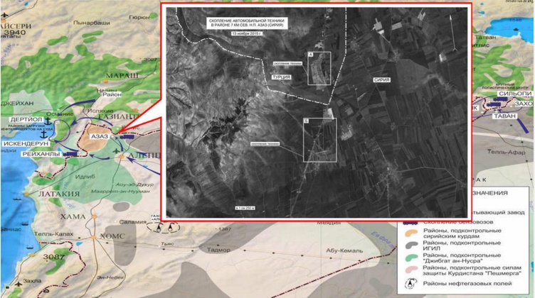 Напомним, что на днях Министерство обороны РФ предоставило спутниковые СНИМКИ, на которых четко видно, как с подконтрольных ИГИЛ регионов, бензовозы с ворованной нефтью следуют в Турцию. На фото видно, что конечный пункт машин с «черным золотом» сирийского происхождения – Турция.