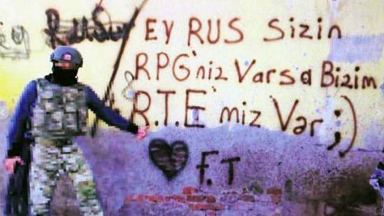 Фотография расписанной стены уже активно распространяется в интернете. Бойцы специального подразделения подписывают фото: «Мы не боимся русских и российского вооружения (РПГ – это ручной противотанковый гранатомет), так как мы воюем за турецкого президента (РТЭ – это Реджеп Тайип Эрдоган».