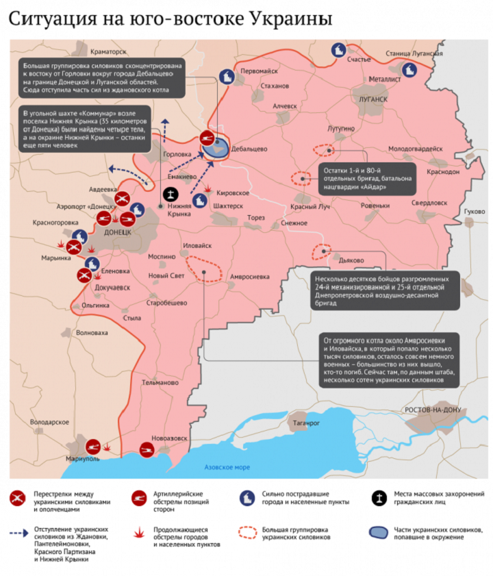 Подтвердилось существование остатков котла на стыке границ ЛНР и ДНР чуть юго-западнее села Дьяково. Отмечена активизация партизан в районе села Красная Таловка на севере ЛНР. Шесть украинских карателей были ранены и 12 убиты при ночной атаке на аэропорт Донецка. Из Дебальцево в полночь были слышны взрывы и видны вспышки со стороны н.п.Чернухино. Утром все было уже относительно тихо.