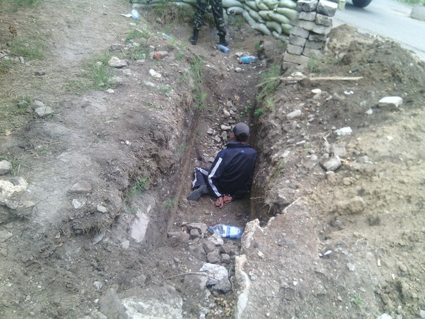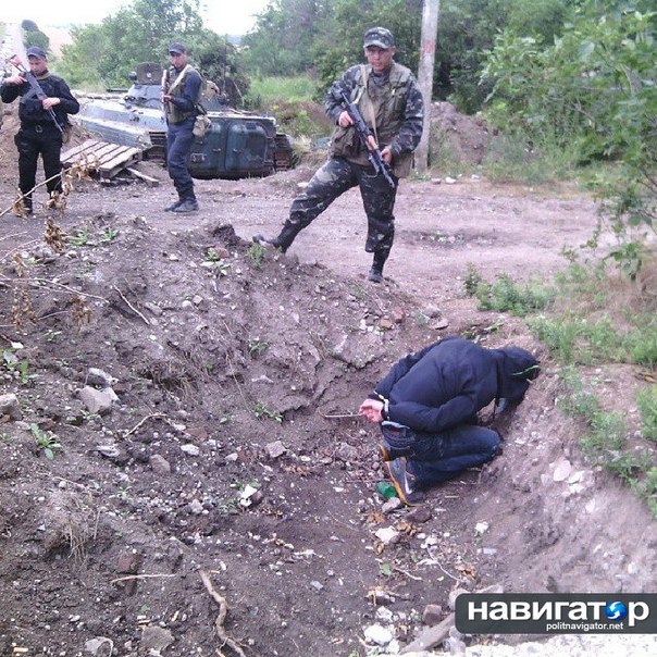 Украинские солдаты позируют на фонее ополченцев, которые загнаны в яму со связанными руками и ждут смертельного выстрела. Этого "героя АТО" зовут Андрей Кудерский. В окопе - живые ещё ополченцы, которых собираются расстрелять. Фото размещены на странице Кудерского в ВК.
