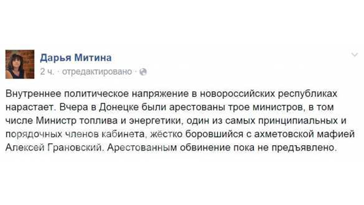 В руководстве ДНР происходят малопонятные изменения: арестованы два министра правительства республики глава минэнерго ДНР Алексей Грановский и вице-премьер кабмина ДНР Александр Калюсский. "превышение полномочий" - официальный комментарий по данному факту. Вот каково было первое сообщение о задержании чиновников.