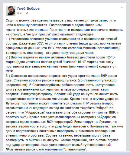 ЛНР, Глеб Бобров, руководитель союза писателей ЛНР, сообщил через свою страницу в файсбуке, что на территории республики и всего Донбасса в самые ближайшие дни «начнется такой замес, что небо с овчинку покажется». Писатель сообщает, что эта информация пришла из нескольких более чем осведомленных и компетентных источников.