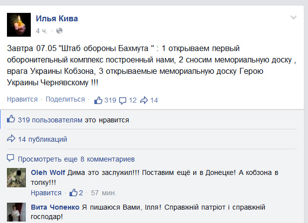 Украина сегодня: в Артёмовске Донецкой области намерены снести мемориальную табличку, которая была там смонтирована в честь Иосифа Кобзона, российского певца. Сообщение о предстоящем сносе разместил в своем аккаунте в соцсети Илья Кива, замглавы областного подразделения милиции.