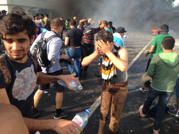 Беженцы, которые стремятся попасть в закрытую для них Венгрию, а оттуда в Австрию и ФРГ, предприняли попытку проломить или хотя бы расшатать стену. Когда в полицейских полетели палки и камни, полисмены вынуждены были станавливать толпу газом и водометами. В свою очередь, мигранты стали поджигать резиновые автомобильные покрышки.