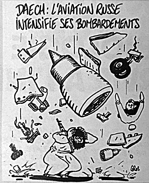 Charlie Hebdo сделал крушение российского А321 в Египте предметом насмешек. Обломки самолета, люди, куски предметов валятся с неба на вжавшего голову в плечи бородатого исламиста-террориста из ИГИЛ*. Таков сюжет первой карикатуры. «Юмористическая» подпись под рисунком-насмешкой гласит: «ИГИЛ: авиация России усилила бомбардировки».