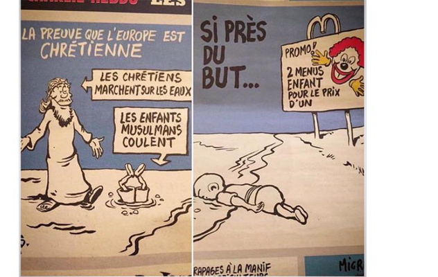 Ранее Charlie Hebdo шокировал европейского читателя карикатурным изображением мертвого сирийского мальчика на берегу – насмешкой над потрясшим весь мир фото. Подпсь «Так рядом с целью» и – на рекламном плакате «Две детских порции по цене одной». Там же разместили второй рисунок на тему беженцев в Европе: «шутка» состояла в том, что «христиане ходят по воде, а мусульманские дети тонут».