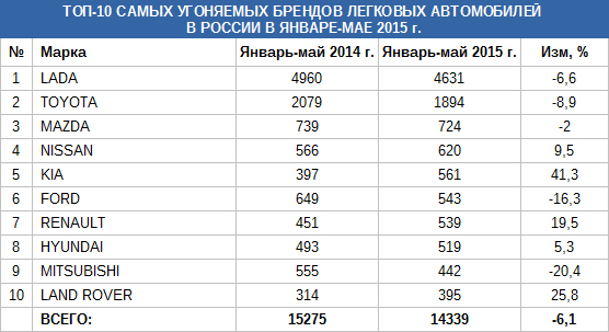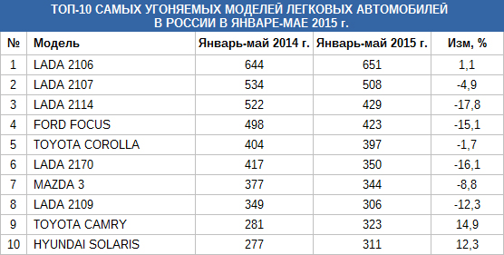 Всего в России за пять месяцев было угнано 14662 автомобилей. На долю отечественной марки ВАЗ пришлось 4631 угонов, второе место заняли японские автомобили Toyota, их украдено 1894 единиц, на третьем месте - Mazda (724 машины).